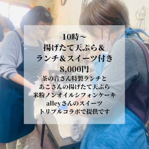 また、こちらの日時ワークショップはランチに米粉なのにサクサク天ぷらが付くとってもお得な内容になっています!