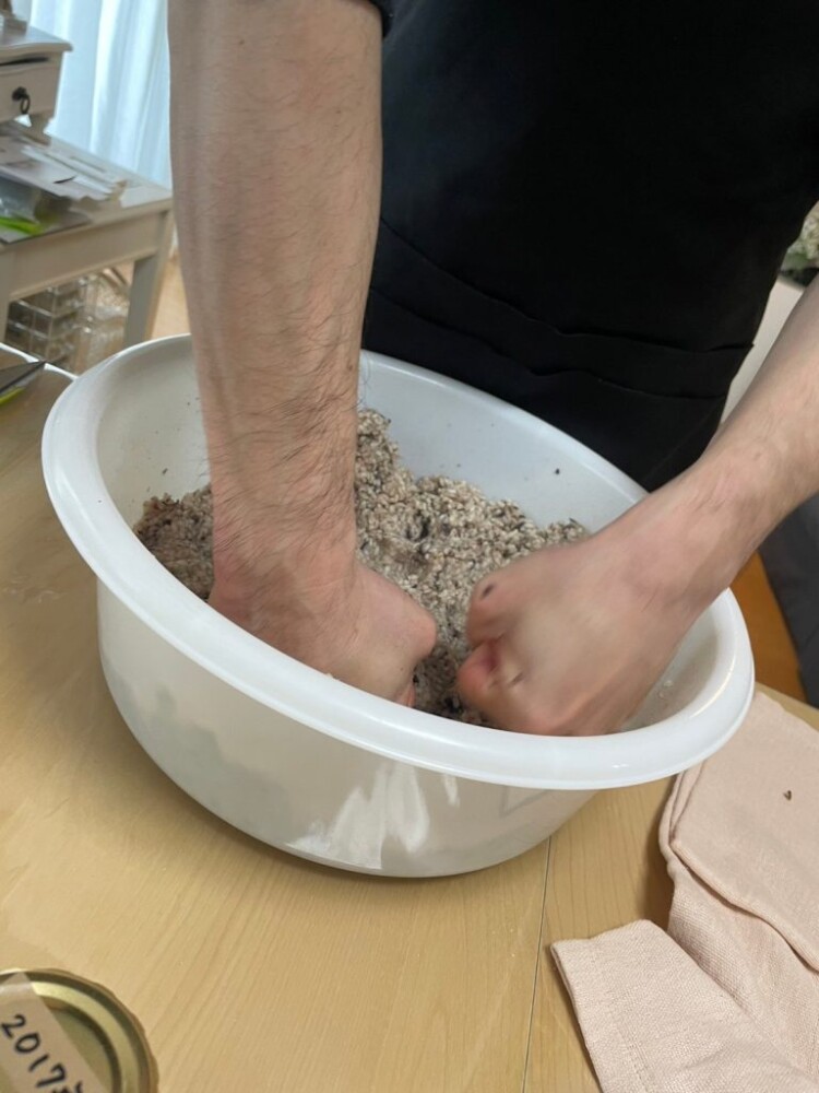 その作業は、大豆をつぶしたり、麹と混ぜ合わせてどこまで麹の粒を滑らかにするのか・・・