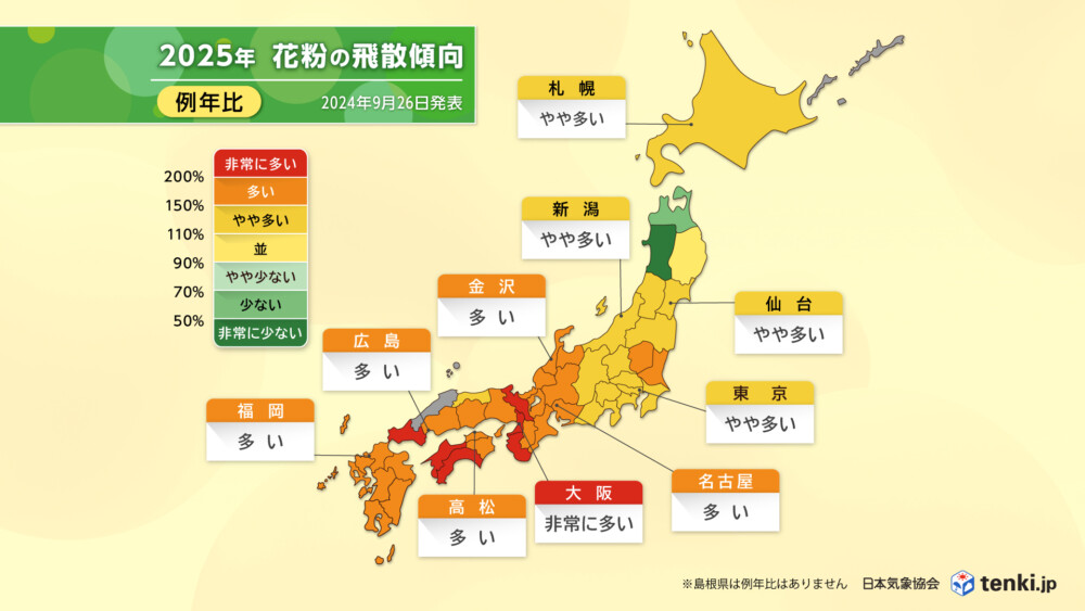 日本気象協会によると、2025年春の花粉飛散量は前シーズン(2024年)と比べると、